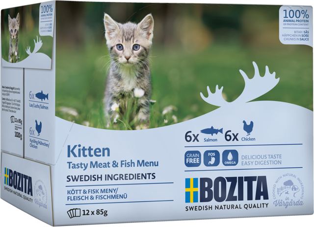Bozita Kitten to kompletna karma dla kociąt i młodych kotów, kotek w ciąży oraz karmiących. Zawiera pełnowartościowe kwasy tłuszczowe z łososia, które są m.in ważne dla rozwoju i funkcjonowania mózgu i wzrok u kociąt. Jednoporcjowe saszetki to pyszna, bezzbożowa pełnoporcjowa karma, zawierająca niezbędne witaminy i minerały, których potrzebuje Twój kot. Wszystkie składniki są naturalne, świeże i pochodzą ze szwedzkiej wsi i naturalnej przyrody. Współpracujemy ze szwedzkimi farmami i wybieramy tylko najwyższej jakości surowce.