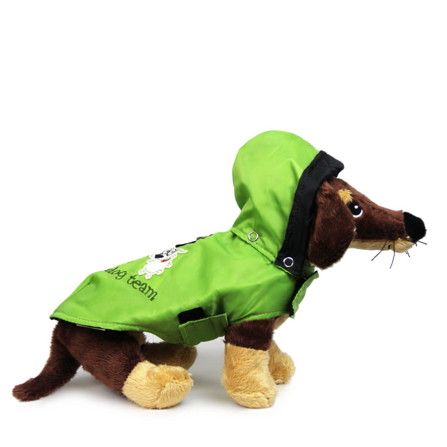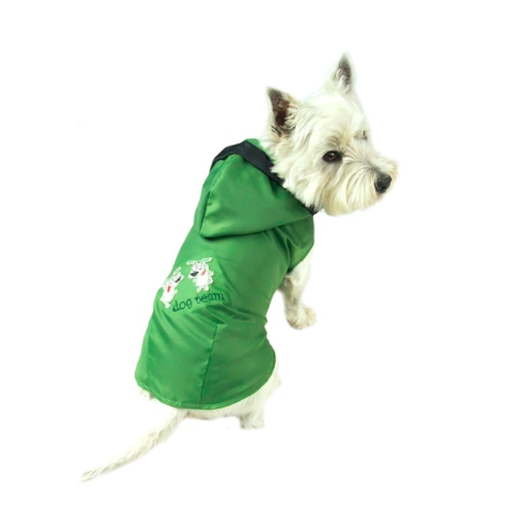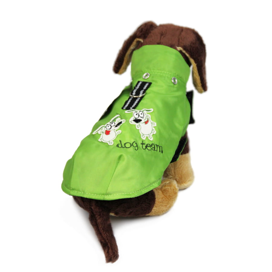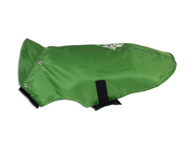 Ubranko z nieprzemakalnego ortalionu, idealna ochrona przed wiatrem, deszczem i zimnem. Ubranko od spodu podszyte jest ocieplaną pikówką. Na plecach przyszyte zostało metalowe kółko, do którego można zapiąć smycz. Dodatkowo jest możliwość odpięcia kaptura.