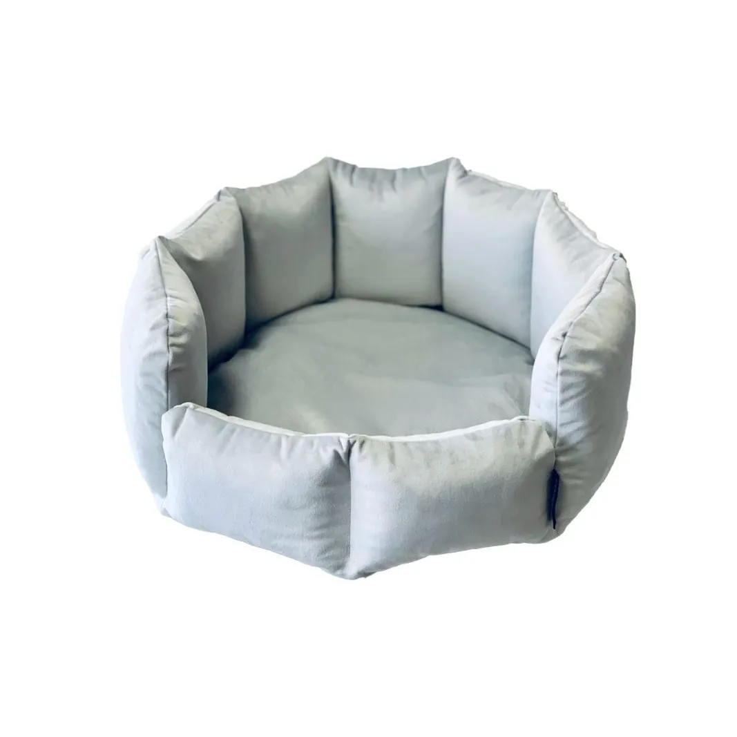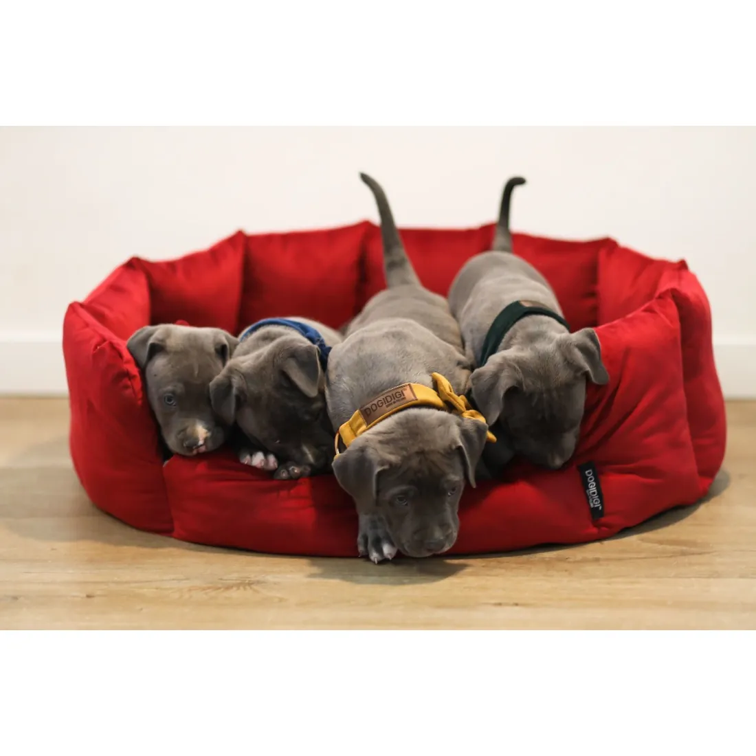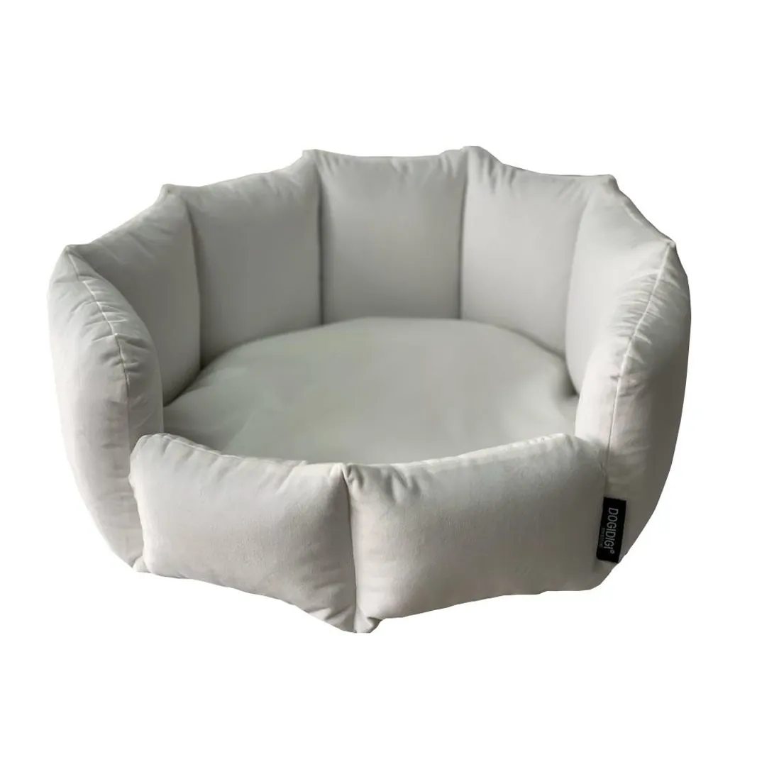 Legowisko charakteryzuje okrągły kształt posłania otoczony pionowymi ściankami wypełnionymi ociepliną. Jak każde legowisko DogiDigi spód legowiska składa się dwóch warstw - tkaniny antyalergicznej oraz miękkiej poduszki. Taka konstrukcja zapewni odpowiedni stopień izolacji, nawet w przypadku używania legowiska na zewnątrz lub na chłodnej posadce.
