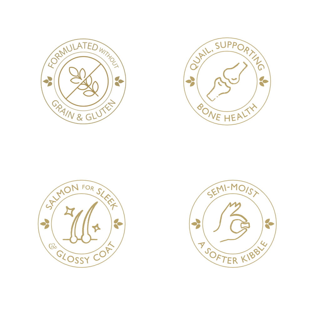 26% suszony łosoś, 21% przepiórka (mrożona), gliceryna roślinna, słodkie ziemniaki, 6% tłuszcz wieprzowy, 5% dziczyzna (mrożona), lucerna, 2% wątróbka wieprzowa (mrożona), tapioka, ciecierzyca, dynia, jabłko, jeżyna, seler, cykoria, 0,03% glukozamina, 0,033% metylosulfonylometan (MSM), 0,02% siarczan chondroityny.