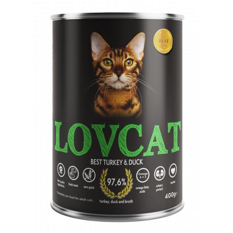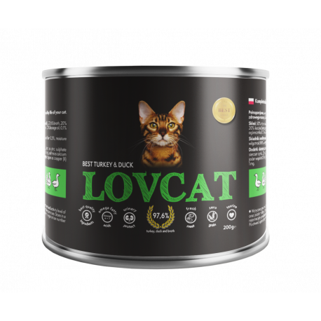 Pełnoporcjowa, wysokomięsna (aż 97,6% mięsa) karma dla kotów, idealnie zbilansowana dla wsparcia zdrowego rozwoju Twojego kota. Receptura oparta na świeżym mięsie najwyższej jakości. Mięso użyte w procesie tworzenia karmy LOVCAT spełnia najbardziej rygorystyczne normy. Każdy dodany składnik jest starannie selekcjonowany, aby oferowany kotu posiłek spełniał najwyższe standardy jakości karmy wilgotnej dla mięsożercy.