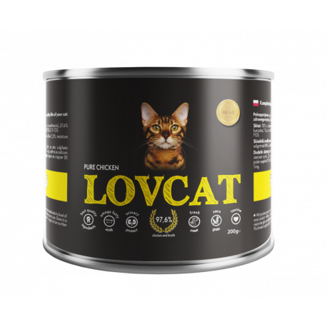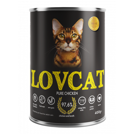 Pełnoporcjowa, wysokomięsna (aż 97,6% mięsa) karma dla kotów, idealnie zbilansowana dla wsparcia zdrowego rozwoju Twojego kota. Receptura oparta na świeżym mięsie najwyższej jakości. Mięso użyte w procesie tworzenia karmy LOVCAT spełnia najbardziej rygorystyczne normy. Każdy dodany składnik jest starannie selekcjonowany, aby oferowany kotu posiłek spełniał najwyższe standardy jakości karmy wilgotnej dla mięsożercy.