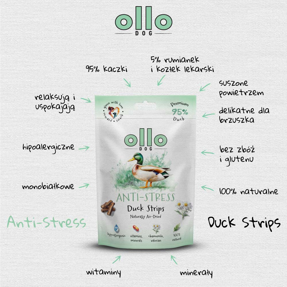 Skład: 95% kaczka (50% mięso mięśniowe, 45% podroby, żeberka i chrząstki), kozłek lekarski i rumianek 5%
