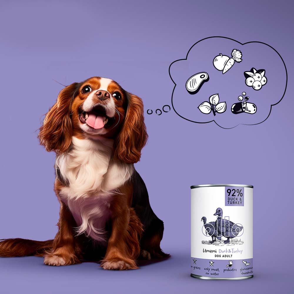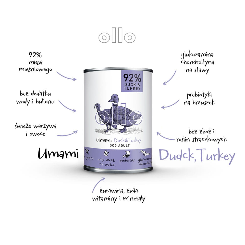 Mokra, pełnoporcjowa karma Ollo Umami Duck & Turkey oparta na mięsie z kaczki i indyka. Jest optymalną dietą zapewniająca psom zdrowie i energię. Psy to zwierzęta mięsożerne, których układ pokarmowy jest ukształtowany tak, aby czerpać energię z mięsa innych zwierząt. Optymalna dieta każdego psa powinna być bogata w mięso, z niewielkim dodatkiem węglowodanów.