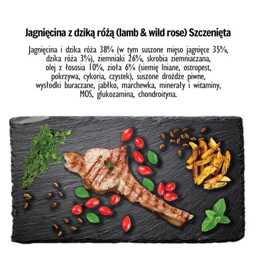 | mięsa jagnięcego, dzikiej róży, oleju z łososia, ziemniaków oraz ziół | grochu, zbóż, konserwantów, sztucznych barwników i wypełniaczy |