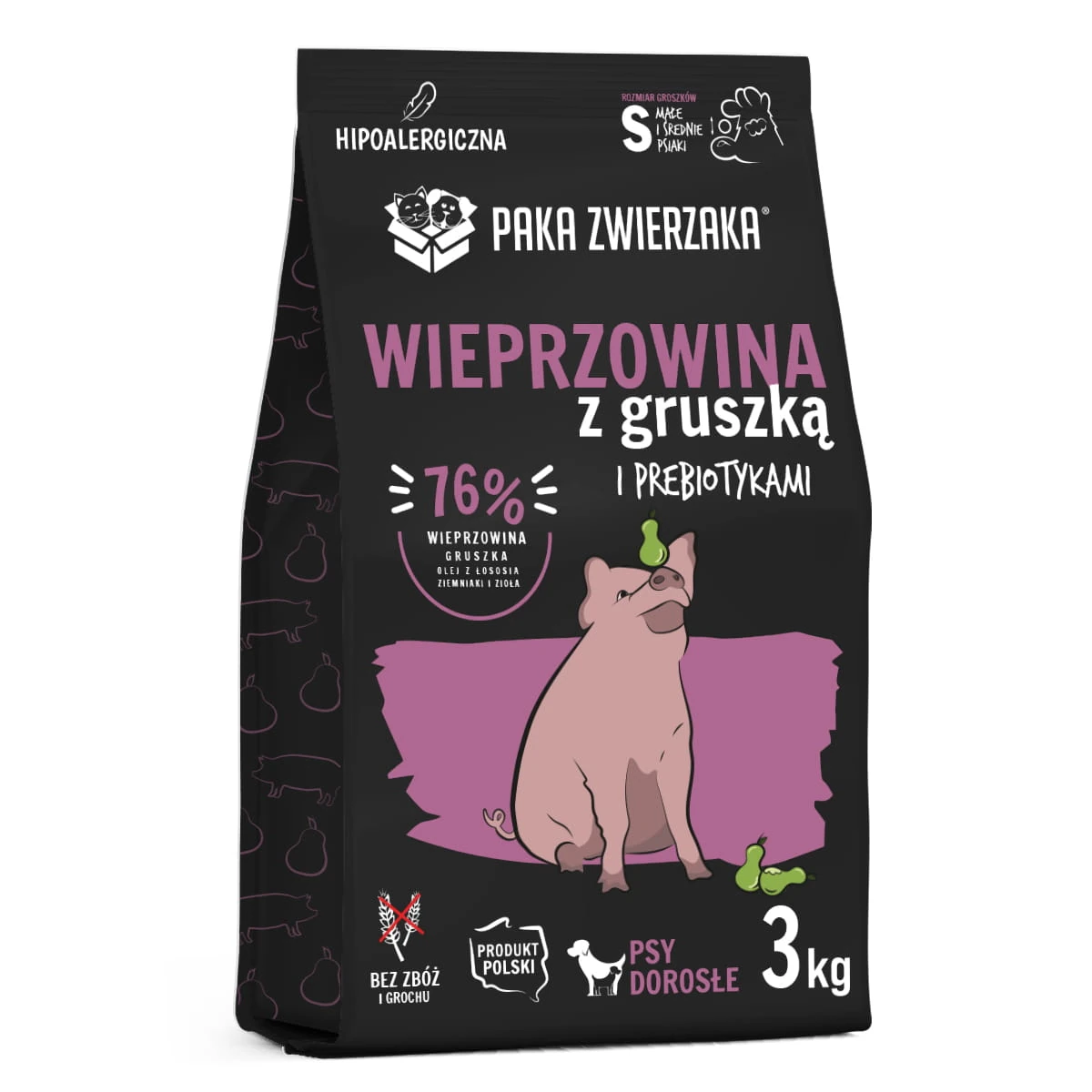 Wieprzowina i gruszka 42% (w tym suszone mięso wieprzowe 35%, tłuszcz wieprzowy 5%, gruszka 2%), ziemniaki 20%, skrobia ziemniaczana, zioła 9% (siemię lniane, ostropest, lucerna, cykoria, pokrzywa, czystek), olej z łososia 5%, wysłodki buraczane, suszone drożdze piwne, minerały i witaminy, pietruszka 2%, MOS, glukozamina, chondroityna.