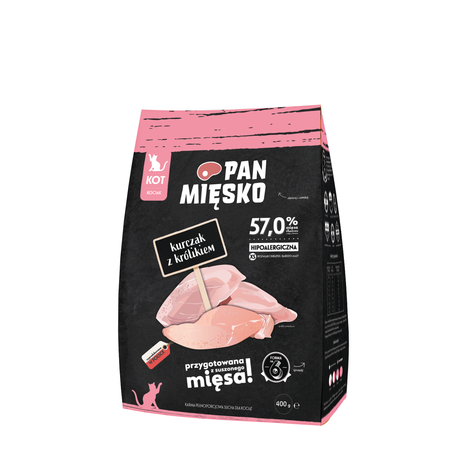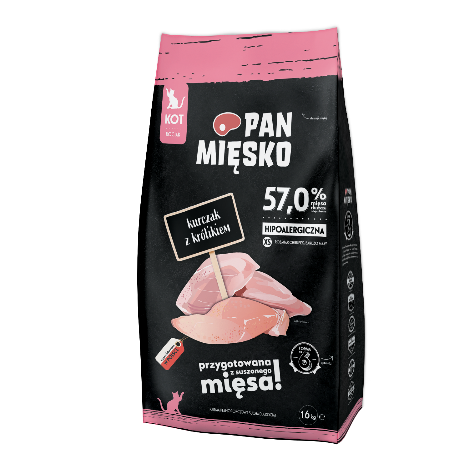 Hipoalergiczne suche karmy dla kotów Pan Mięsko wyróżniają się starannie wyselekcjonowanym mięsem z dodatkiem soczystych polskich jabłek, zdrowych warzyw i cennych składników odżywczych, które pozytywnie wpłyną na zdrowie oraz kondycję Twojego kota. Receptury zostały przygotowane przez specjalistów, po to, aby dostarczyć Twojemu czworonożnemu towarzyszowi dokładnie to, czego potrzebuje. Twój kot zasługuje na wszystko, co najlepsze.