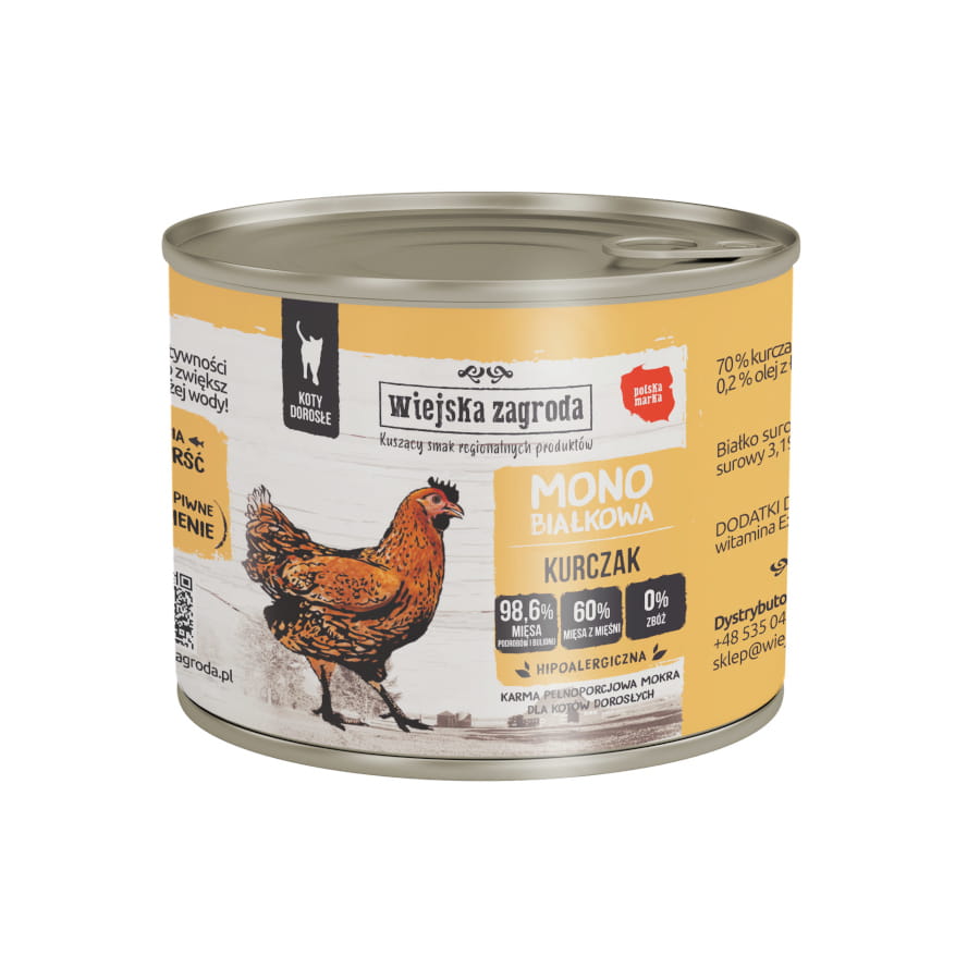 Monoproteinowe karmy mokre Wiejska Zagroda dla kota, zawierają jeden rodzaj mięsa, które plasuje się na pierwszym miejscu w składzie. Oprócz wysokiej jakości mięsa, każda formuła zawiera także wyjątkowe dodatki takie jak tauryna, które wspomagają zdrowie organizmu mruczka.